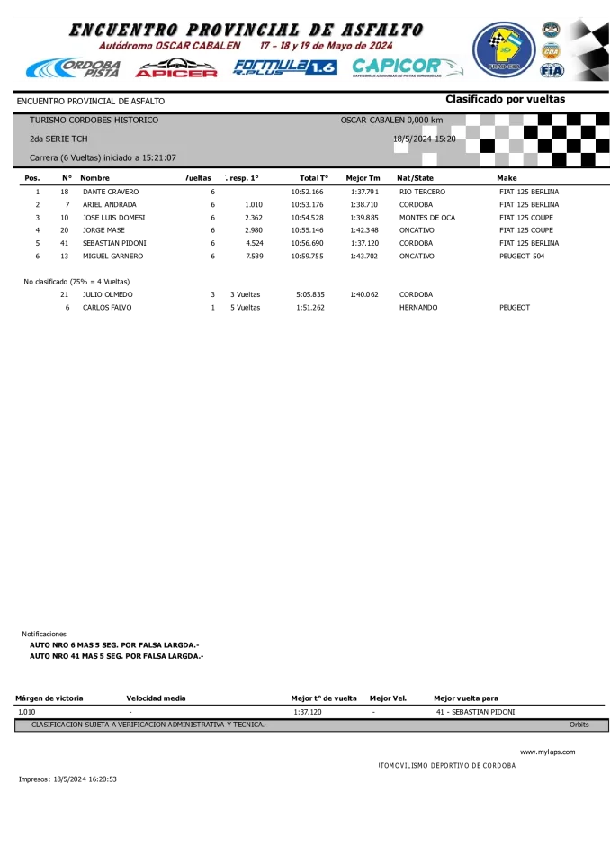 En el evento denominado «Encuentro Provincial de Asfalto», donde se reunieron a mas de 150 autos, este sábado el Turismo Clase 3, Monomarca 1.4, Turismo Cordobés Histórico y Turismo Promocional cumplieron este sábado con la clasificación de la segunda fecha de la temporada 2024.