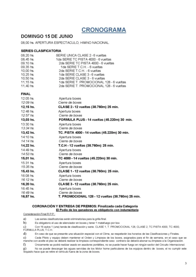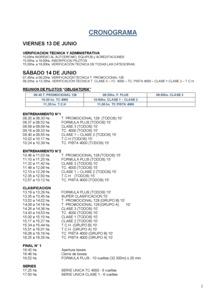 - Sábado: habrá entrenamientos y clasificaciones para todas las categorías. Además, la Fórmula Plus disputará su primera final, mientras que Clase 1 y TC4000 correrán sus respectivas series.