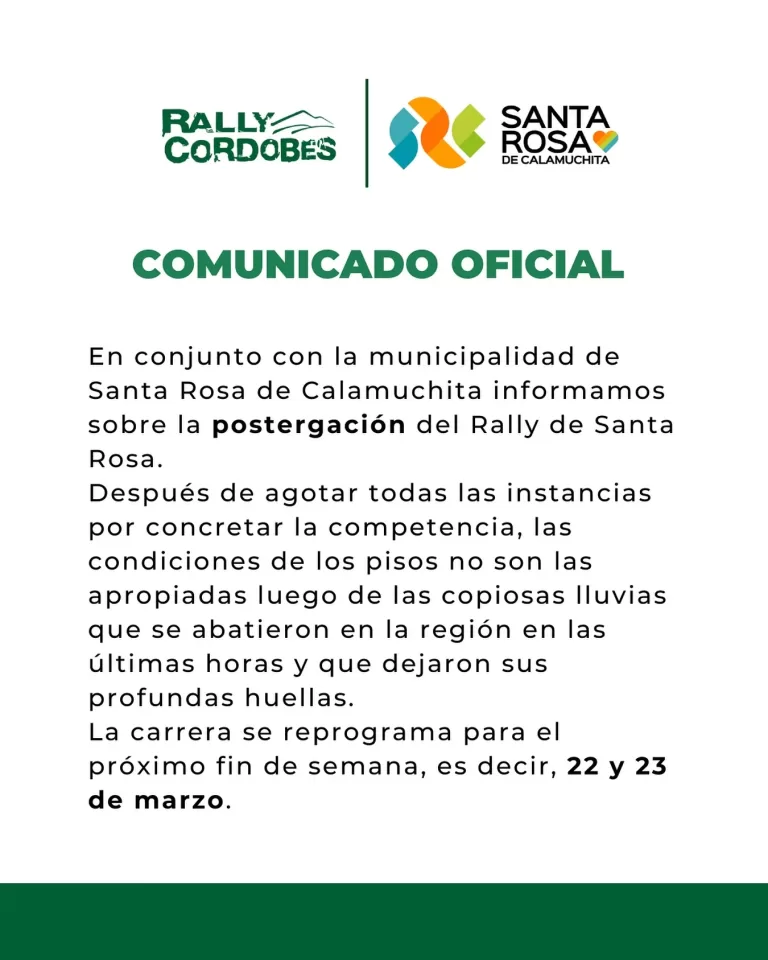 Durante los días anteriores se venía especulando en cuanto con respecto al factor climático, y finalmente las lluvias de las últimas horas en la provincia arruinaron la mayoría de los tramos que iban a recorrer los autos del certamen. Por ese motivo, Rally Cordobés y la municipalidad de la localidad llegaron a la conclusión de reprogramar el evento.