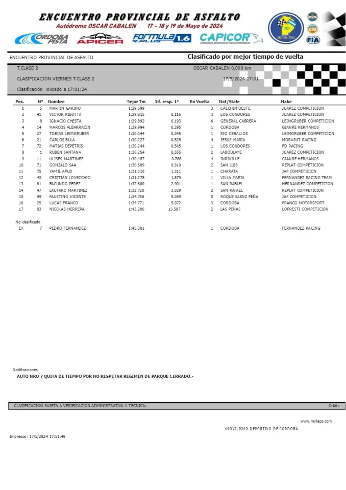 Durante la sesión clasifcatoria de la Clase 2, Garino empezó de muy buena manera el fin de semana. Deberá ganar la clasificación del sábado, para asegurarse el primer punto del fin de semana. Lo escoltaron Víctor Ribotta e Ignacio Chesta.