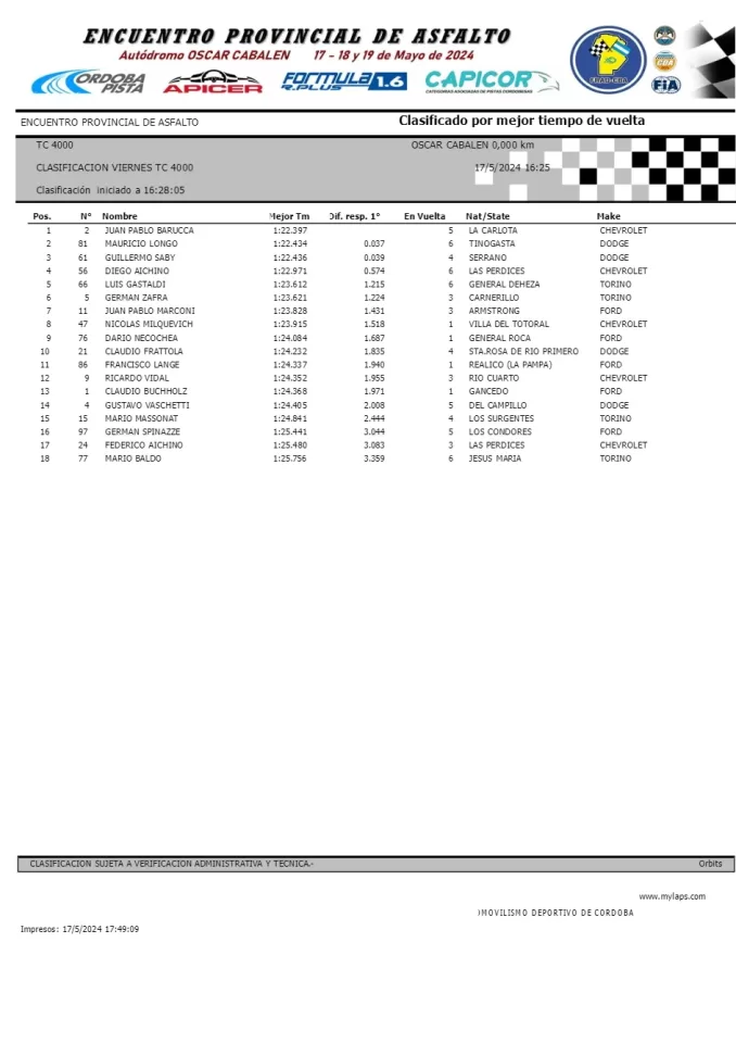 En el transcurso del «Encuentro Provincial de Asfalto», se disputaron las primeras clasificaciones del fin de semana, en las que Martín Garino de la Clase 2 y Juan Pablo Barucca del TC 4000, obtuvieron la pole provisoria que buscarán revalidar este sábado.