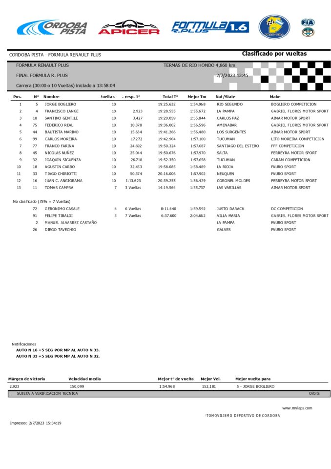 Jorge Bogliero volvió a imponerse en la Carrera Final correspondiente a la sexta fecha de la temporada 2023 para la Fórmula Renault Plus, que se llevó a cabo este fin de semana desde el Autódromo Internacional de Termas de Río Hondo.