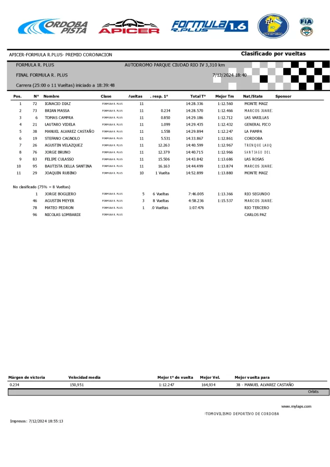 El segundo lugar le correspondió a Brian Massa (Fauro Sport), quien con este resultado estiró la ventaja en el campeonato a 12 puntos respecto a Tomás Campra (Giavedoni Motorsport), quien se subió al tercer escalón del podio. Cuarto finalizó Lautaro Videla (Bogliero Competición) seguido por Manuel Álvarez Castaño, quien en esta fecha regresó con el equipo Giavedoni Motorsport.