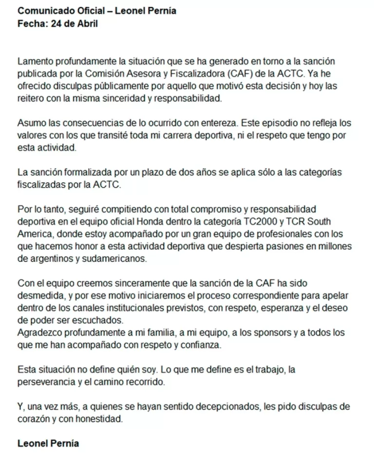 Leonel Pernía emitió un comunicado donde se expresa luego de la durísima sanción que le aplicó la CAF de la ACTC tras el comportamiento inapropiado que tuvo para con uno de los integrantes del ente fiscalizador. La información fue publicada por el medio DSports, donde el piloto de Tandil tiene un programa de streaming junto a su hermano Mariano, su hijo Tiago y el periodista Fernando Carlos.