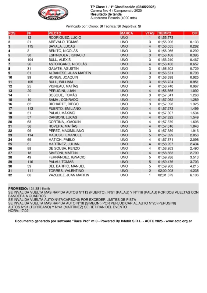 Lucio Rodríguez y el FIAT Uno Fire que alista el Edi-Car Racing se llevaron la primera clasificación de la Clase 1 del Turismo Pista en el Autódromo «Juan Manuel Fangio» de Rosario (Santa Fe), escenario de la cuarta ronda del calendario 2025. Tomás Arévalo y Lucas Bayala terminaron como los escoltas.