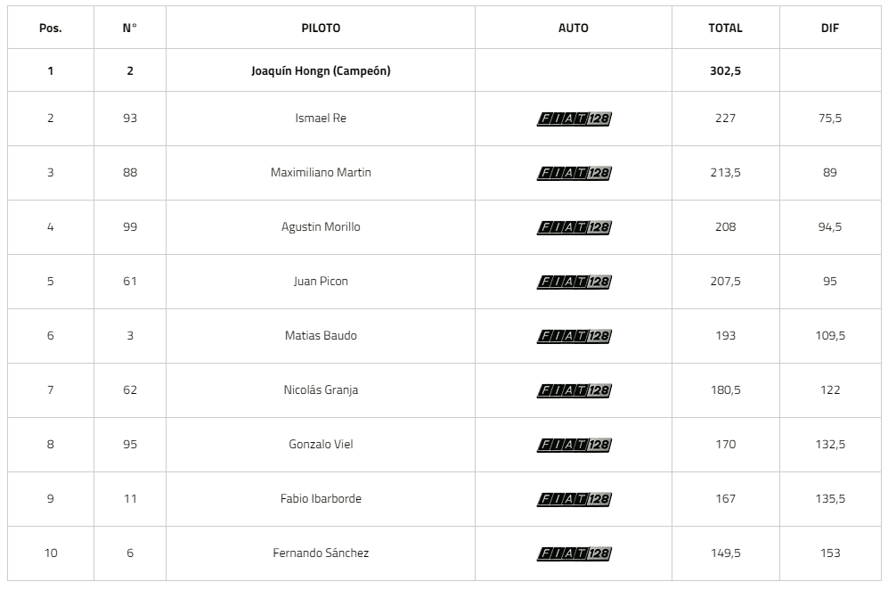 | 2 | 10 | Cristian Rovira | Fiat 128 | 85 | 10 |