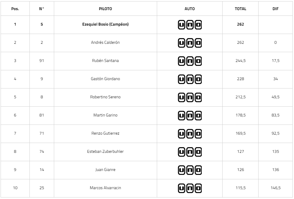 | Pos. | N° | PILOTO | AUTO | TOTAL | DIF |