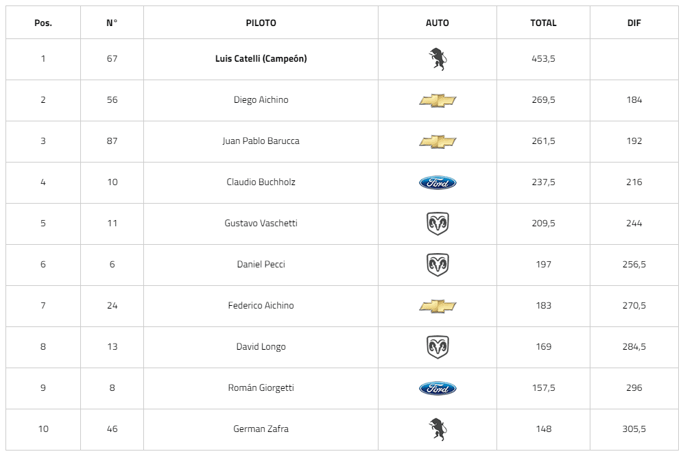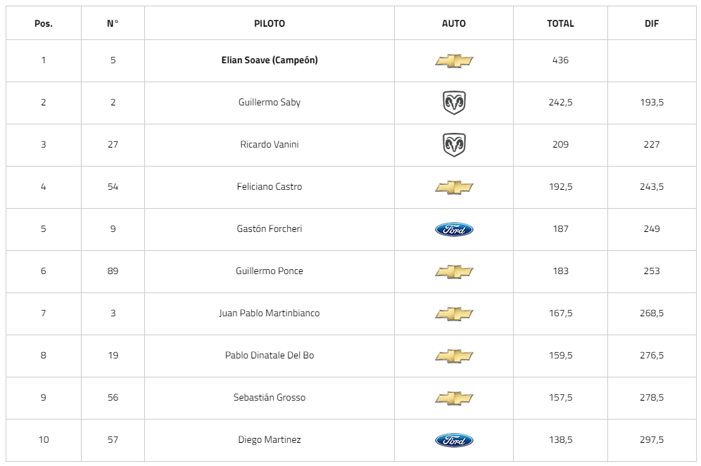 | 1 | 11 | Joaquín Del Pino (Campeón) | Chevrolet | 152 | |
