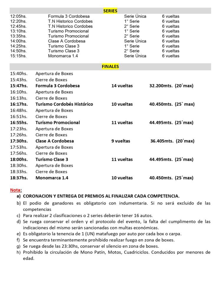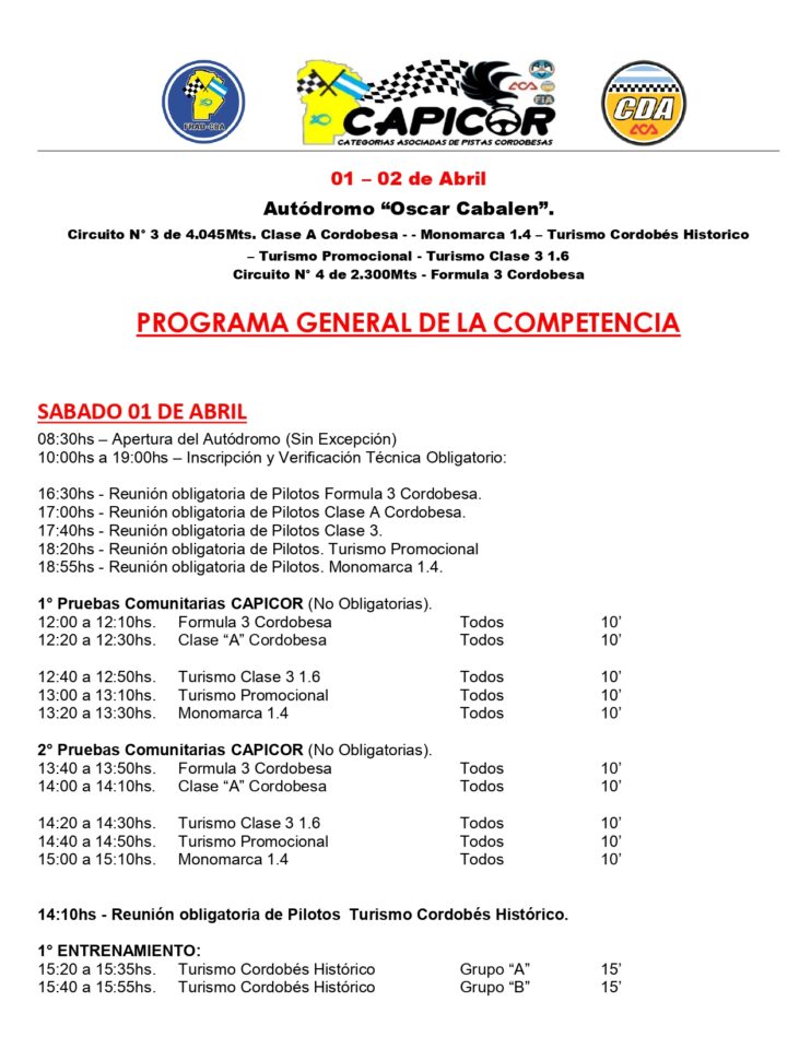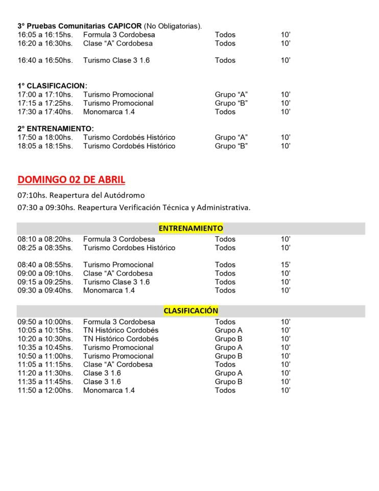 Vale destacar que desde este año, tres categorías cumplirán con la primera clasificación el día sábado que, en esta oportunidad, son el Turismo Promocional, Monomarca 1.4 y Turismo Cordobés Histórico que realizarán su prueba clasificatoria desde las 17:00.