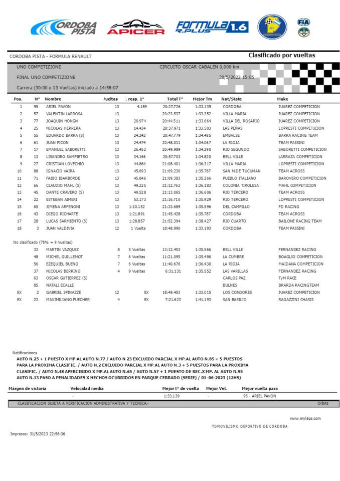 Los Comisarios Deportivos de la Federación Regional de Automovilismo Deportivo de Córdoba (Fradcba), participantes en la cuarta fecha del Campeonato 2023 de Córdoba Pista en el Autódromo «Oscar Cabalén» de Alta Gracia, dieron a conocer la resolución final de la carrera de Uno Competizione, la cual había quedado con resultado en suspenso por verificación deportiva.