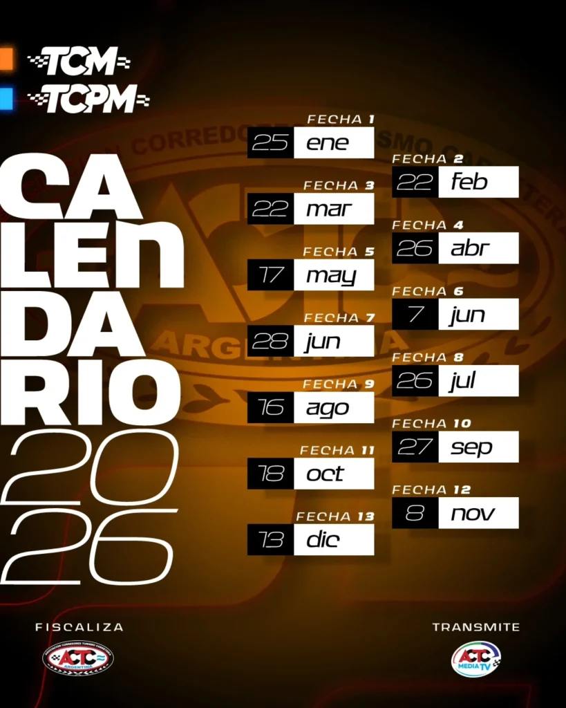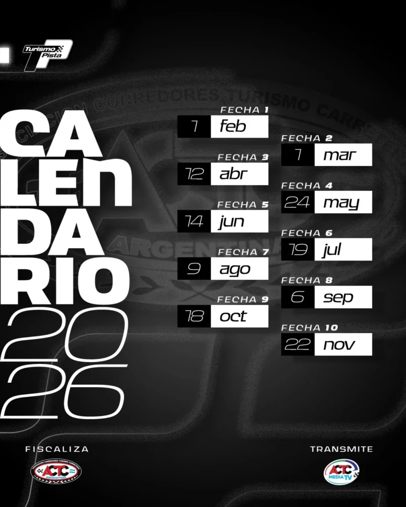 La ACTC dio a conocer el calendario oficial para la temporada 2026 de Turismo Carretera y TC Pista. Tal como se preveía, el campeonato contará con un total de 15 fechas, iniciando la actividad en el mes de febrero y finalizando en diciembre con el Gran Premio Coronación.