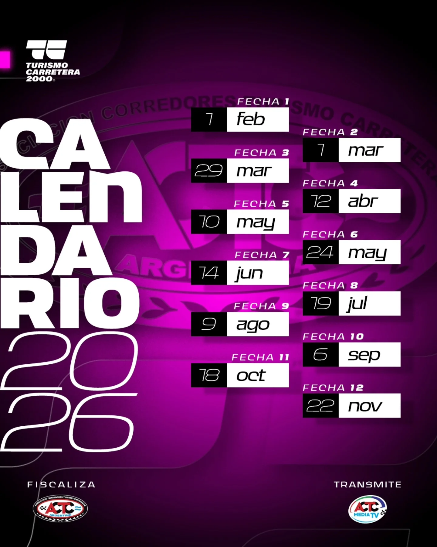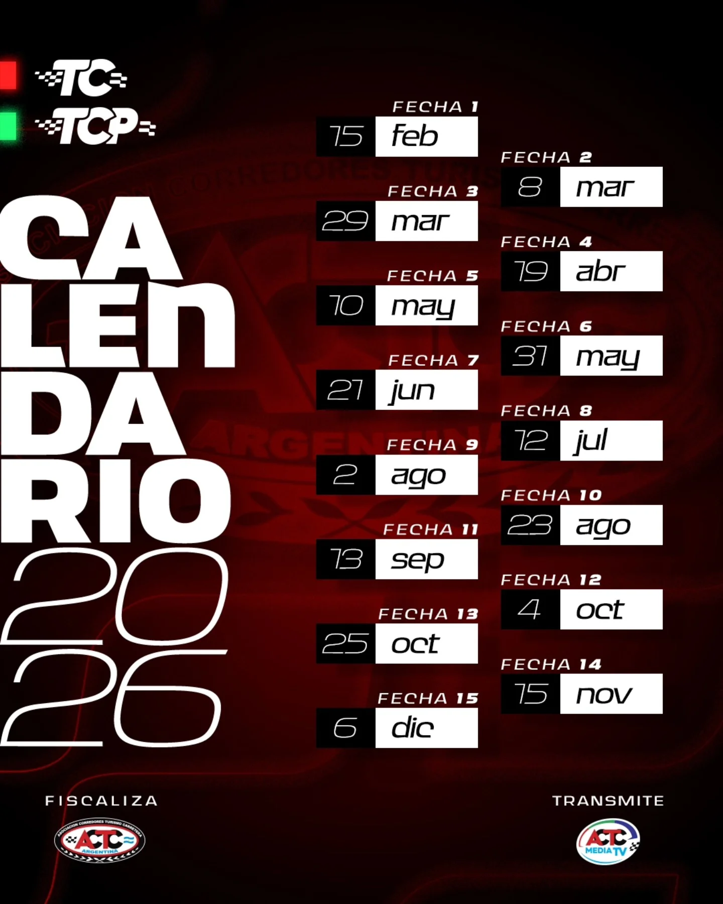 La ACTC dio a conocer el calendario oficial para la temporada 2026 de Turismo Carretera y TC Pista. Tal como se preveía, el campeonato contará con un total de 15 fechas, iniciando la actividad en el mes de febrero y finalizando en diciembre con el Gran Premio Coronación.